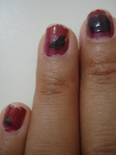 Nesta camada apliquei uma demão bastante vigorosa de vermelho; nas unhas as quais havia perdido as acumulações, este vermelho se mostrou vivo e espesso, já nas unhas onde houve a sobreposição o vermelho se apresentou com uma tonalidade mais escura, puxada para o vinho. Na raiz das unhas apliquei um rosa cintilante que complementou muito bem a composição, estabelencendo uma relação entre a cor leitosa e a cintilante; uma cor que deriva da outra, porém com peculiaridades bem definidas.